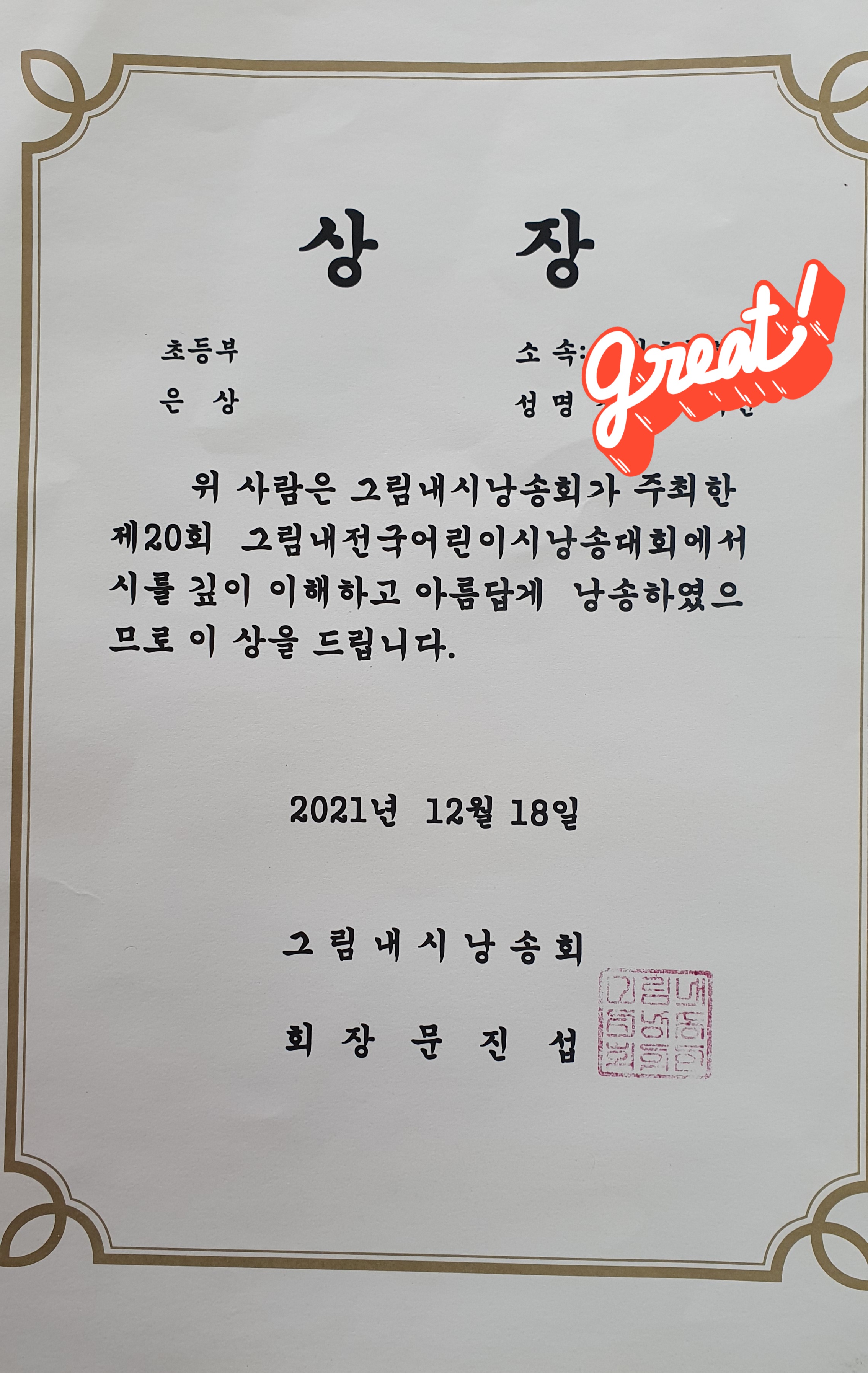 방학식날 그림내전국어린이시낭송대회 상장이 도착을 했습니다.