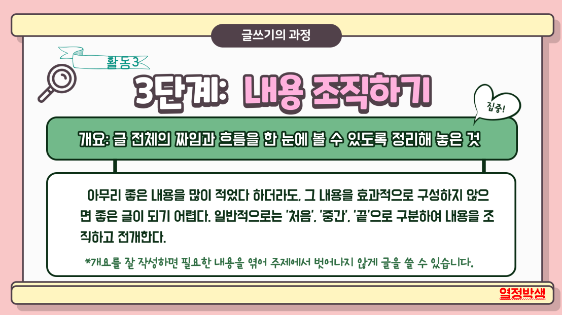 - 글의 주제: 글에 담을 중심내용은 무엇인가?