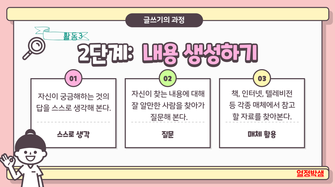 -매체 활용: 책, 인터넷, 텔레비전 등 각종 매체에서 참고할 자료를 찾아본다.