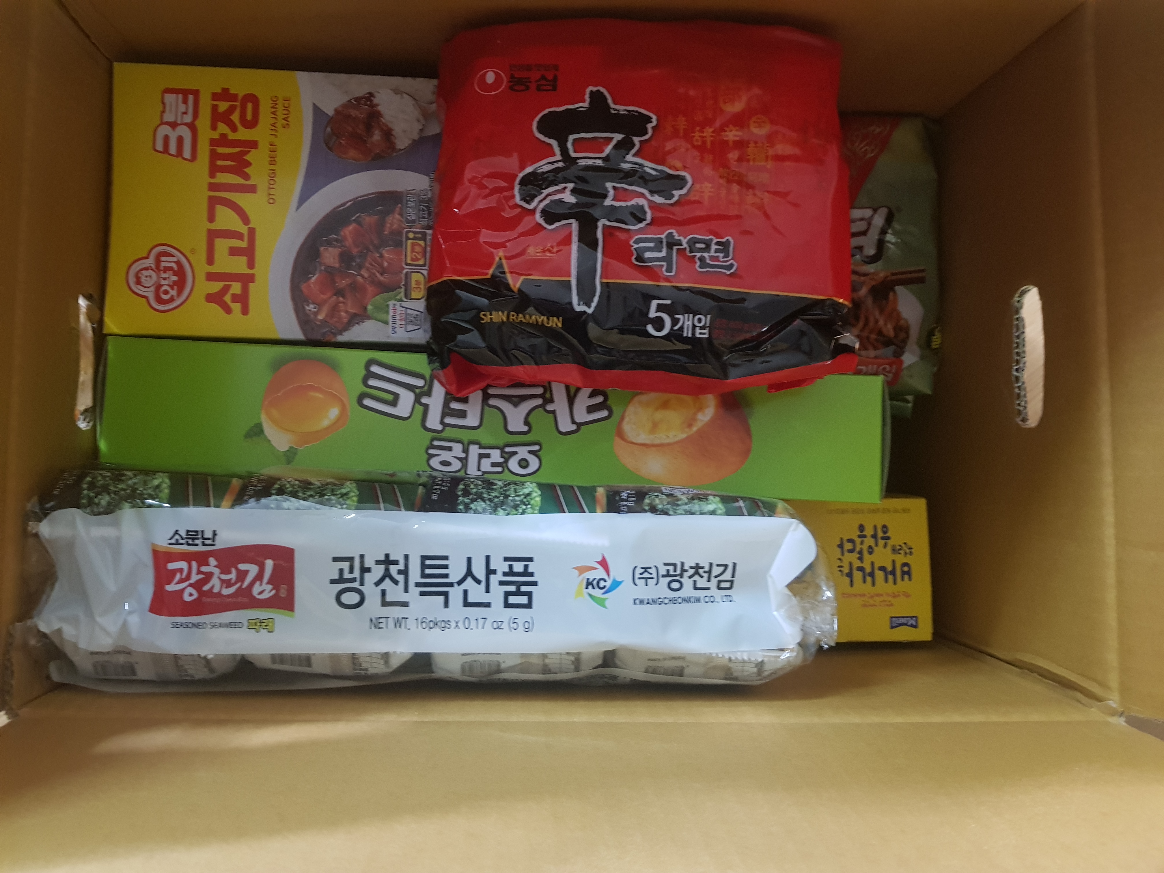 코로나 확진이 되니 군청에서 지원용품도 집으로 배달이 되었습니다. 세상에. 광천김, 오뚜기 컵밥, 바나나우유,카스타드, 신라면, 짜파게티, 3분 짜장, 3분 카레, 3분 미트볼까지.