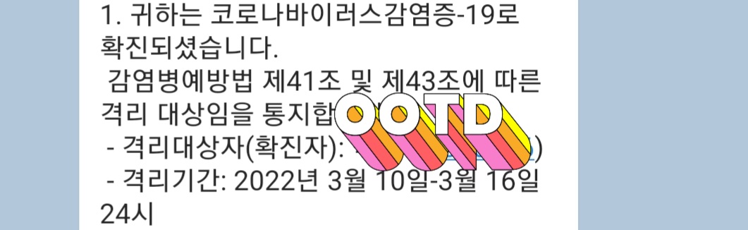 "귀하는 코로나바이러스감영증-19로 확진이 되셨습니다. 감염병예방법 제41조 및 제43조에 따른 격리 대상임을 통지합니다."