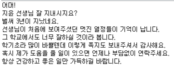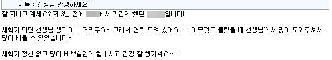 새학기 되면 선생님 생각이 나더라구요~ 그래서 연락 드려 봤어요.^^ 아무것도 몰랐을 때 선생님께서 많이 도와주셔서 많이 배울 수 있었습니다.