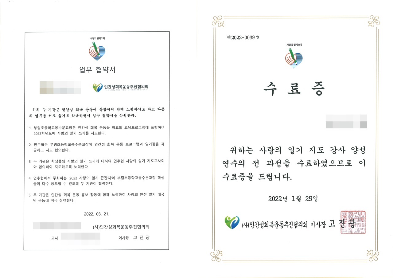 인간성회복운동추진협의회 사랑의 일기 지도 강사 양성 연수가 있다고 하여 이틀에 걸쳐 수료를 했습니다.