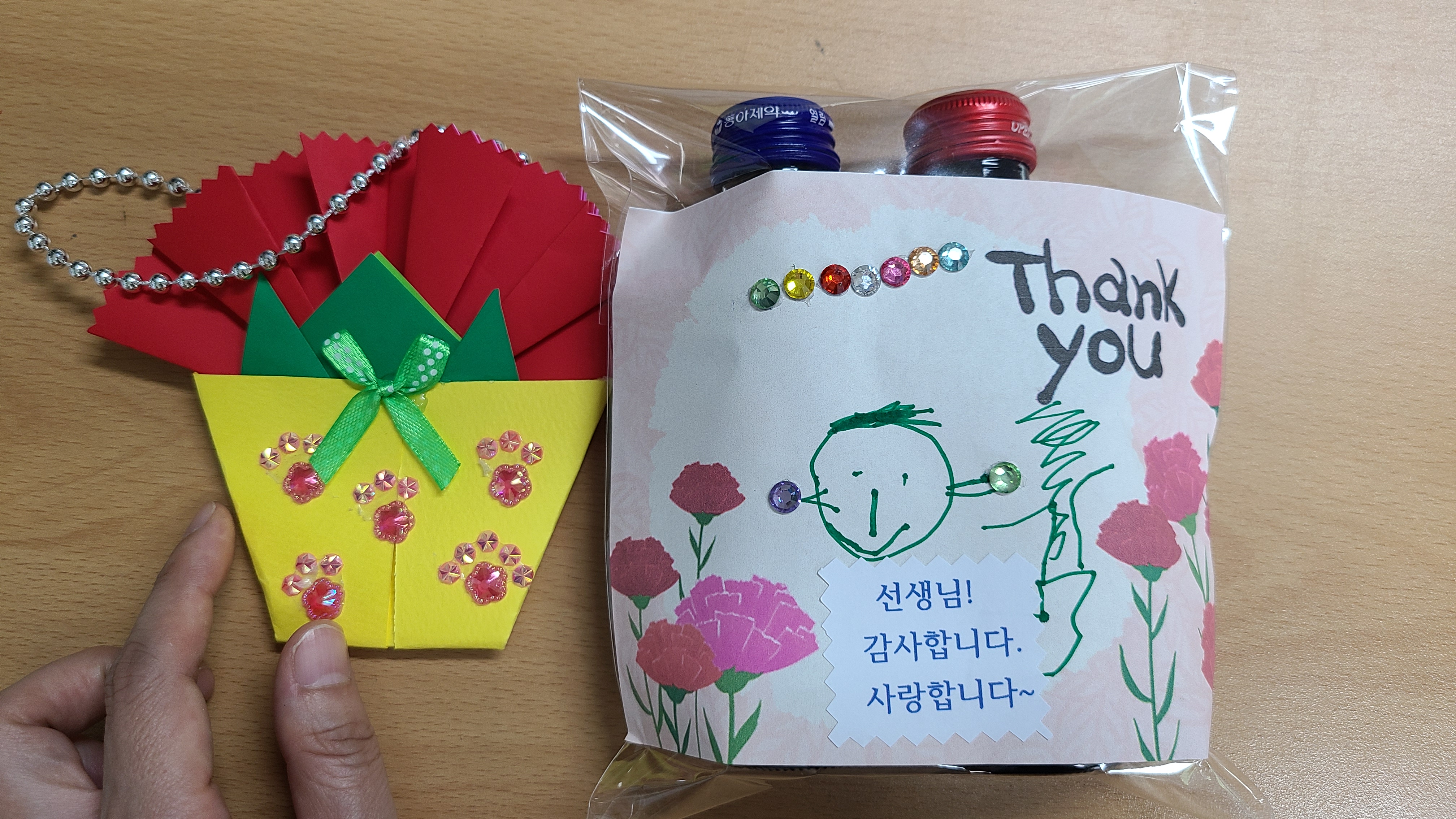 학교에서 선생님들이 아이들을 지도하여 만든 카네이션과 감사패.