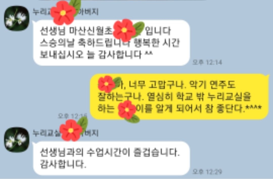 그런 마음이 앞서 있었는데 누리교실로 만난 학생이 동영상으로 보낸 스승의 은혜 노래에 교사로 보람을 느낍니다.