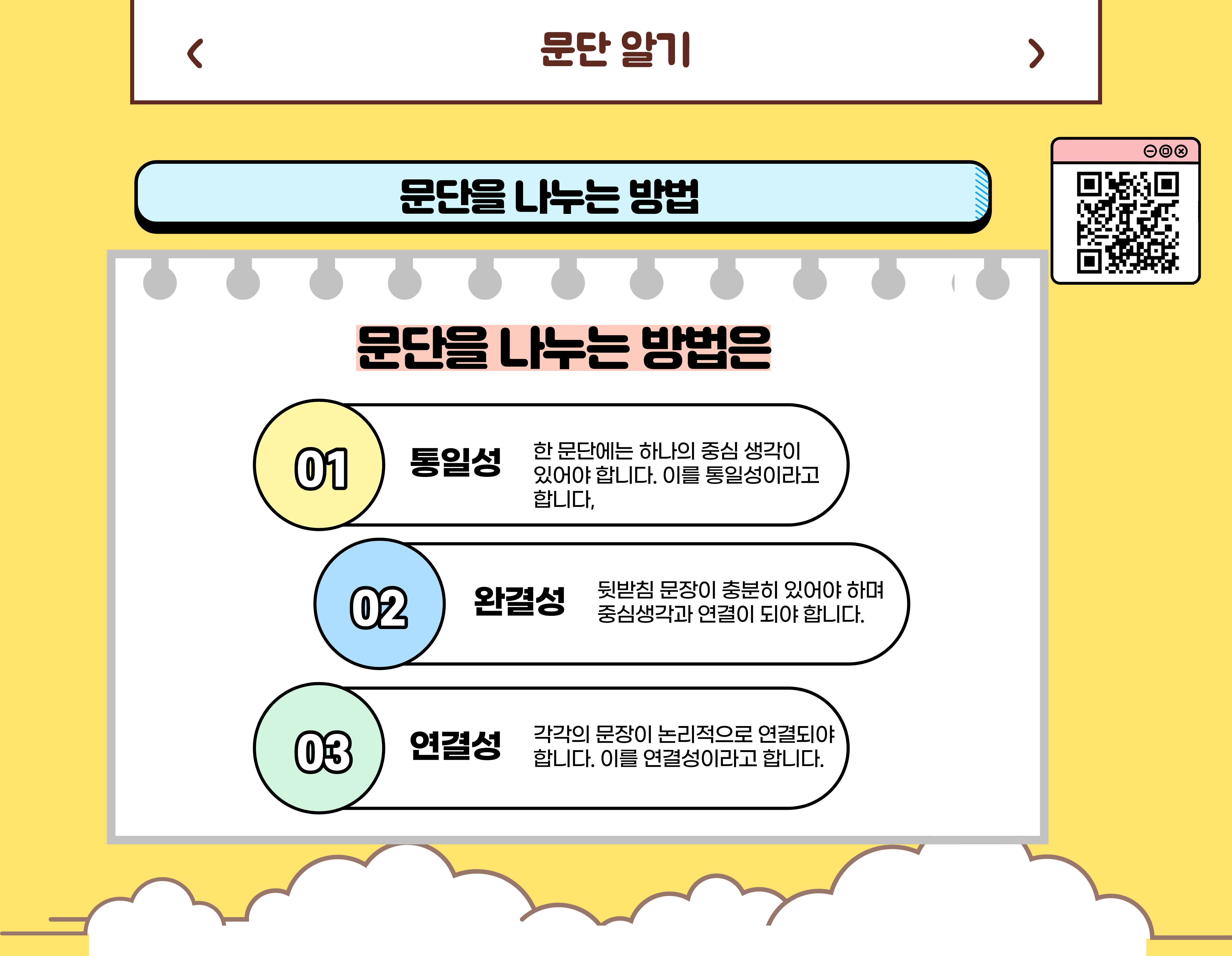따라서 우리는 문단의 통일성, 완결성, 연결성을 생각하며 문단을 나눌 수 있도록 해야겠습니다.