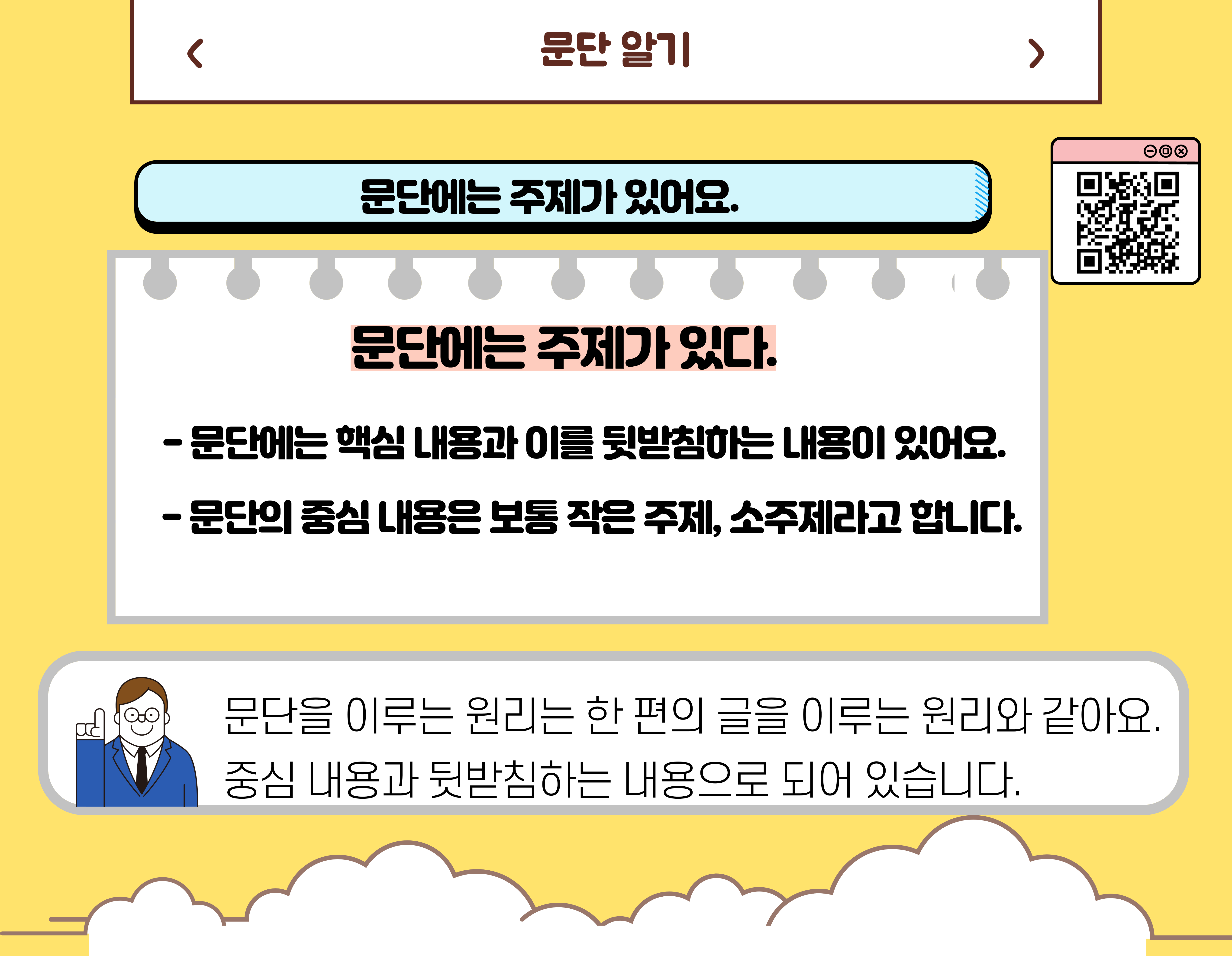 - 문단에는 핵심 내용과 이를 뒷받침하는 내용이 있습니다.