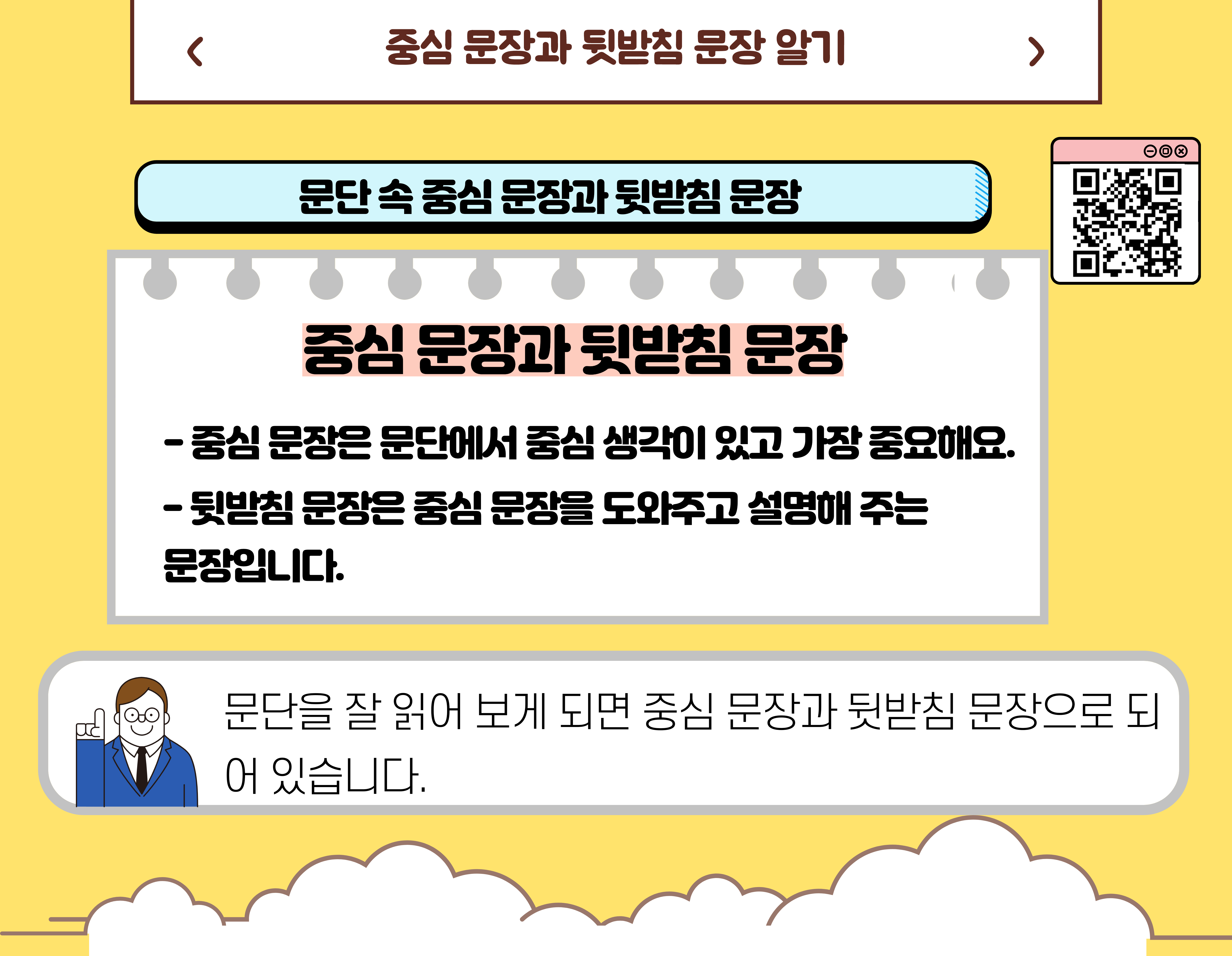 중심 문장과 뒷받침 문장에 대한 학습영상은 아래에 있습니다.