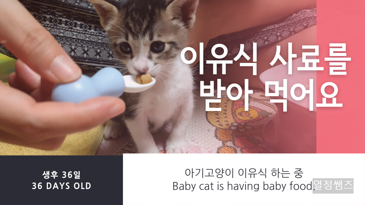 <생후 36일, 아기고양이 이유식, 숟가락으로 사료를 받아먹어요.>