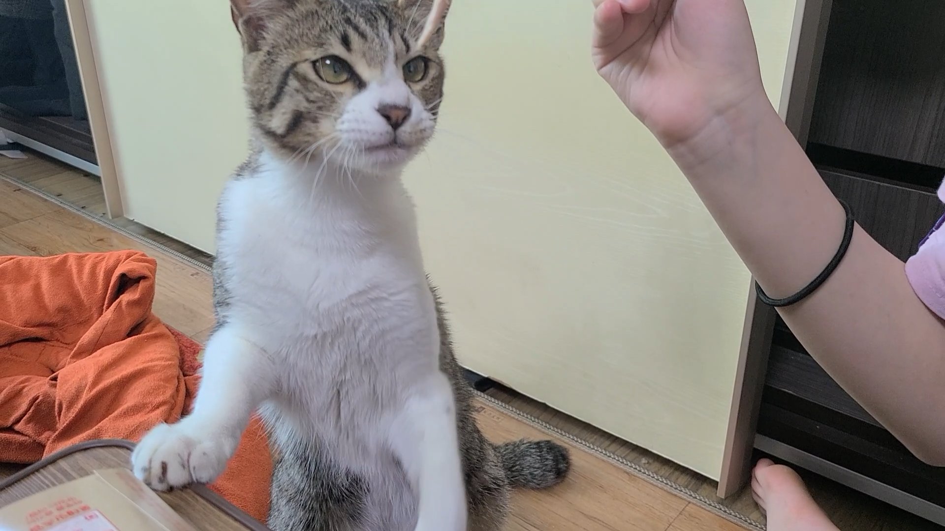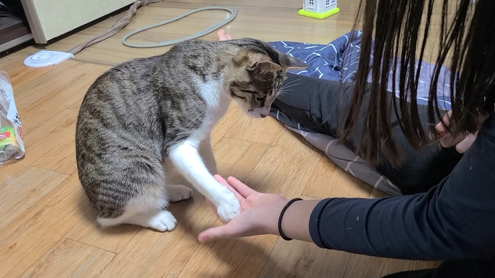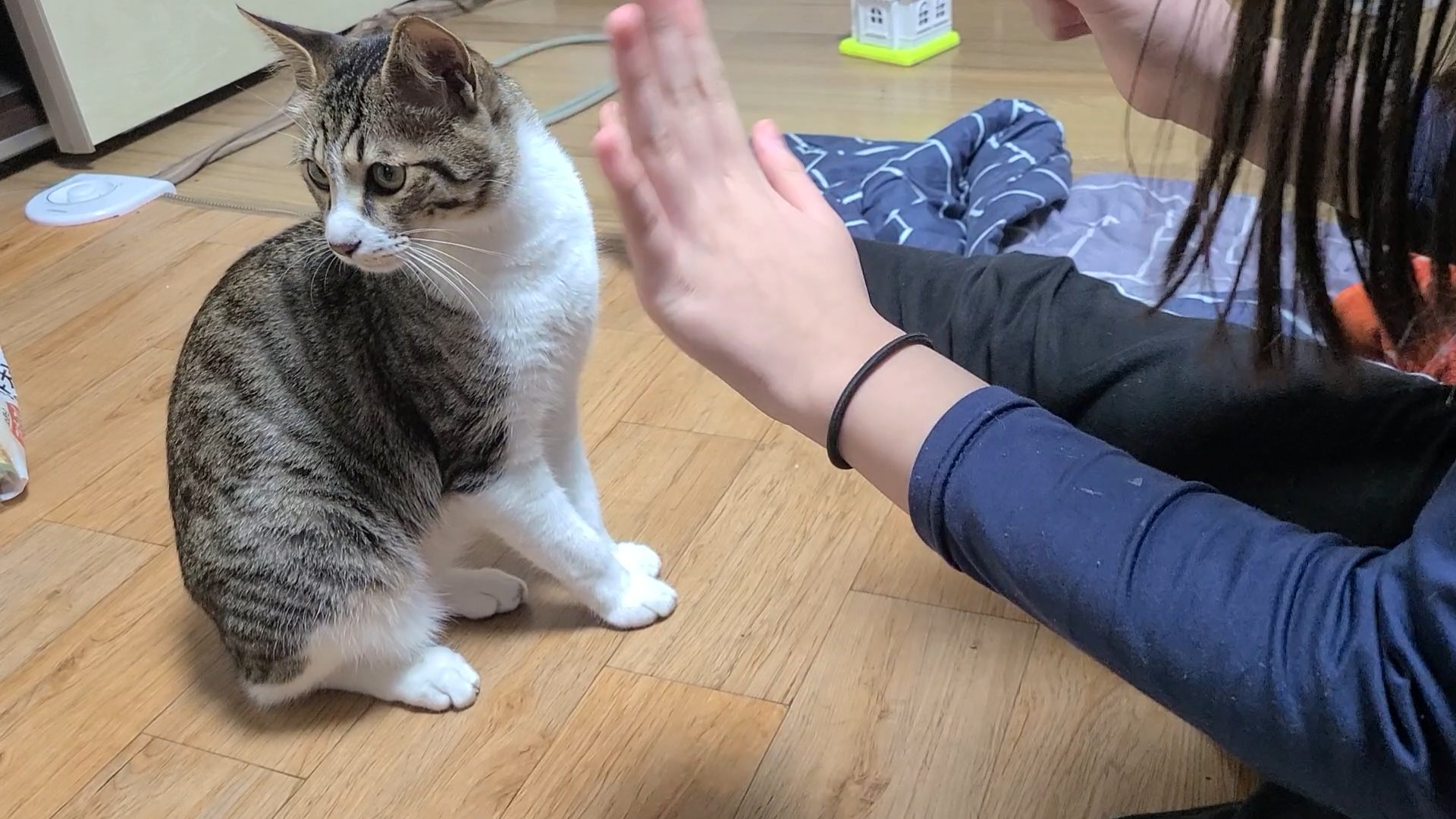 고양이 간식을 줄 때마다 훈련을 시키고 있습니다.