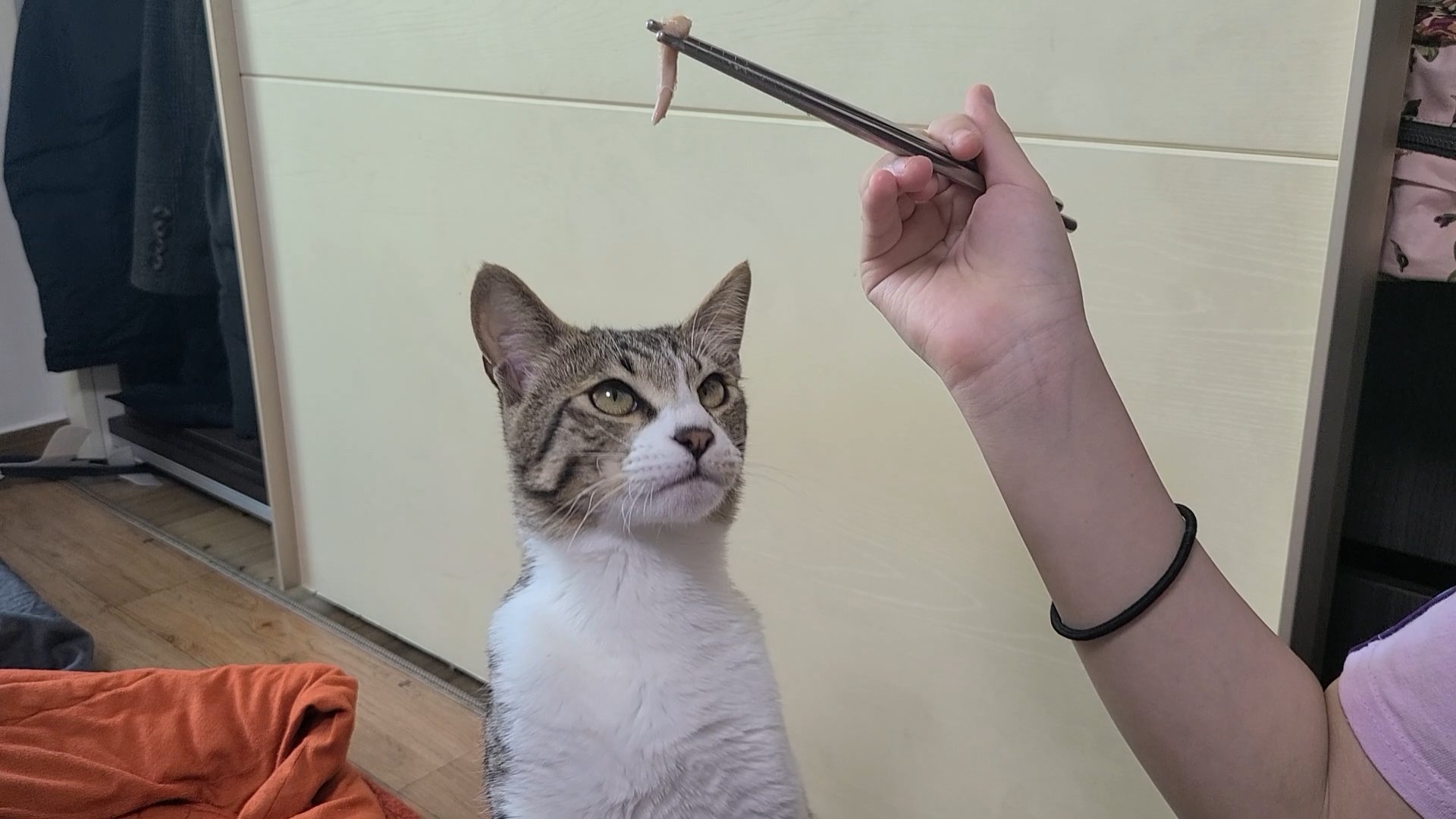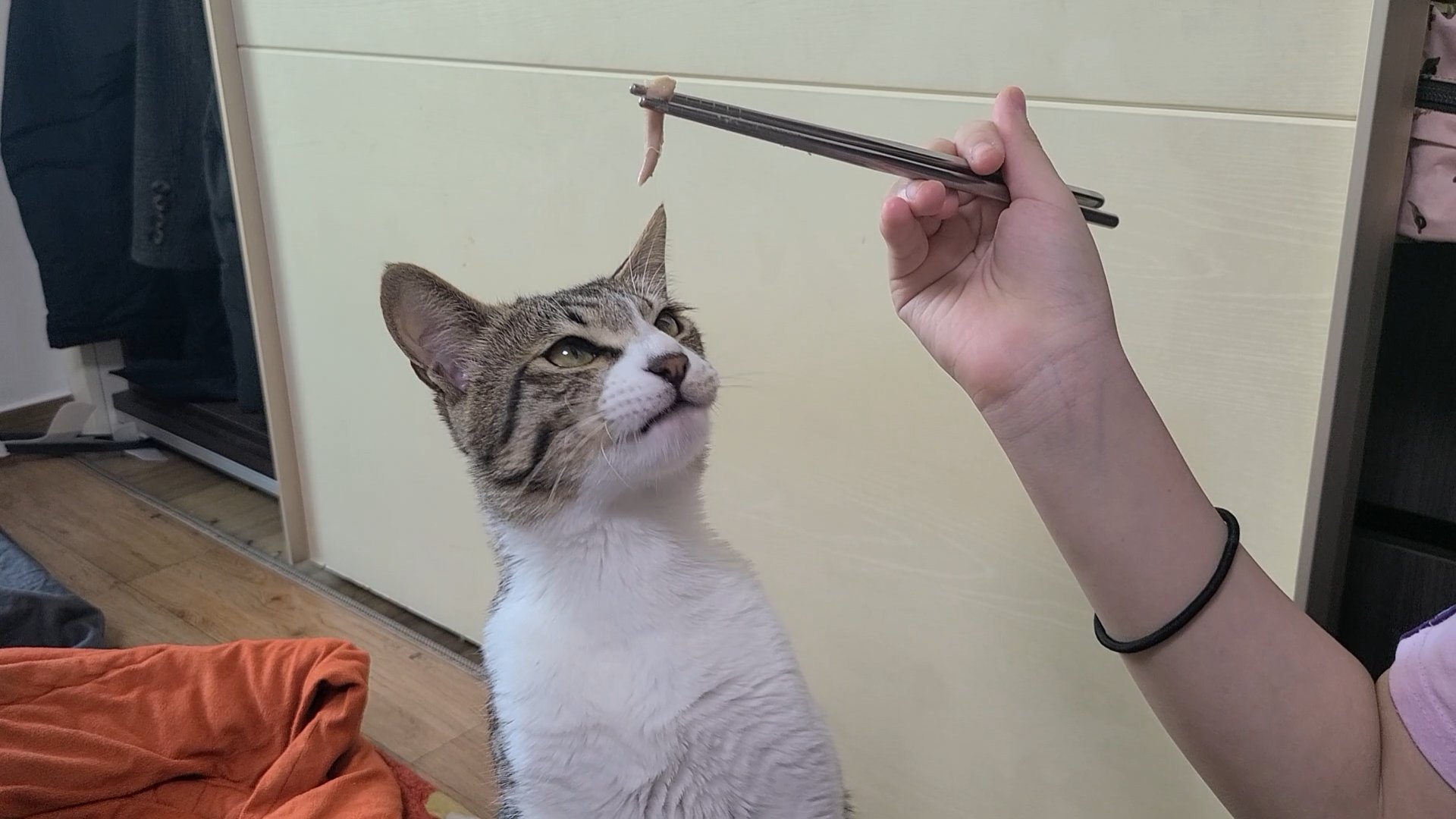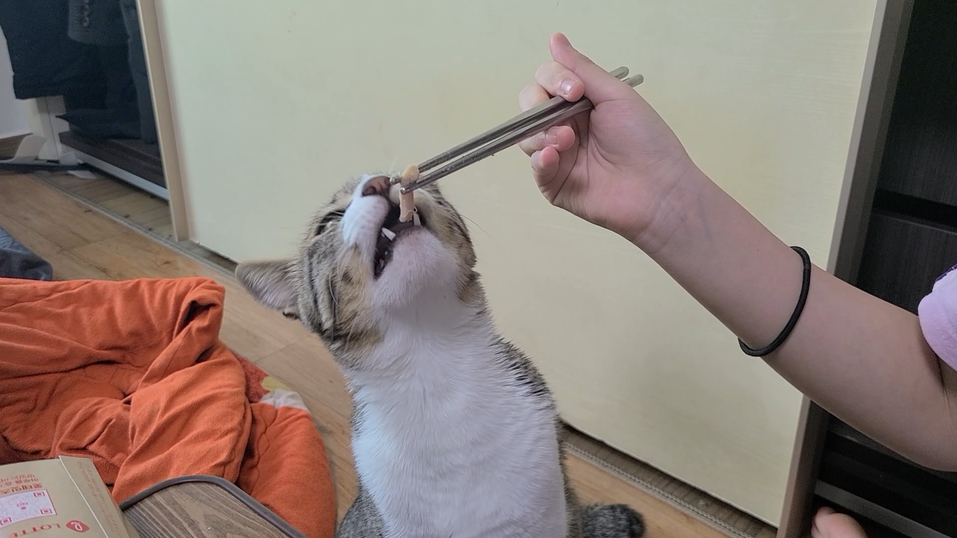 고양이 간식을 줄 때마다 훈련을 시키고 있습니다.