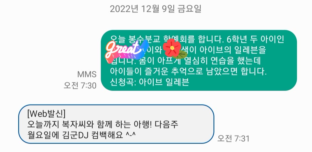 그 바쁜 아침에 아침의 행진 라디오에 사연을 보내서 복자씨가 읽어주셨습니다. 이 날은 김군이 휴가를 가서 복자씨가 대신 하셨습니다.