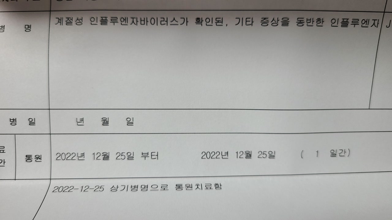 치료확인서에는 계절성 인플루엔자바이러스라고 적혀 있습니다.
