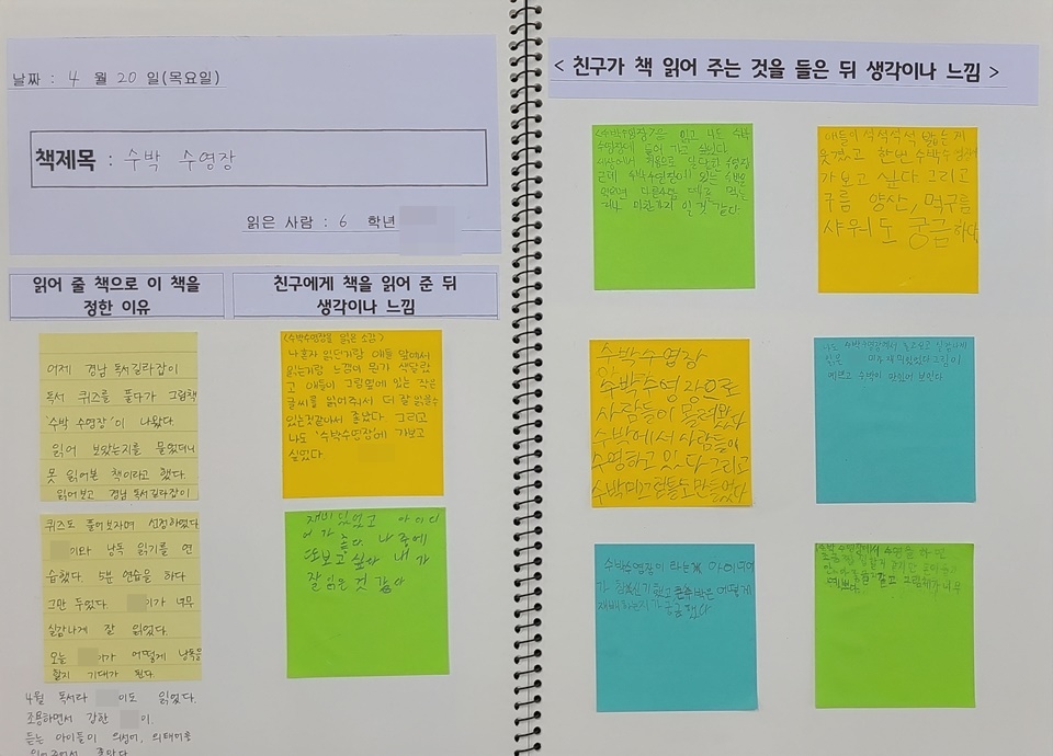 - 친구들 앞에서 읽어주니 너무 부끄러웠지만 뿌듯했다. 하지만 다들 듣기만 하고 있어서 약간 기분이 좋지 않았다.