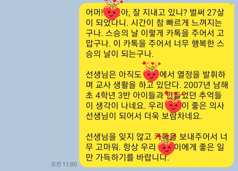 2007년 4학년 때 제자에게 온 카톡이었습니다.