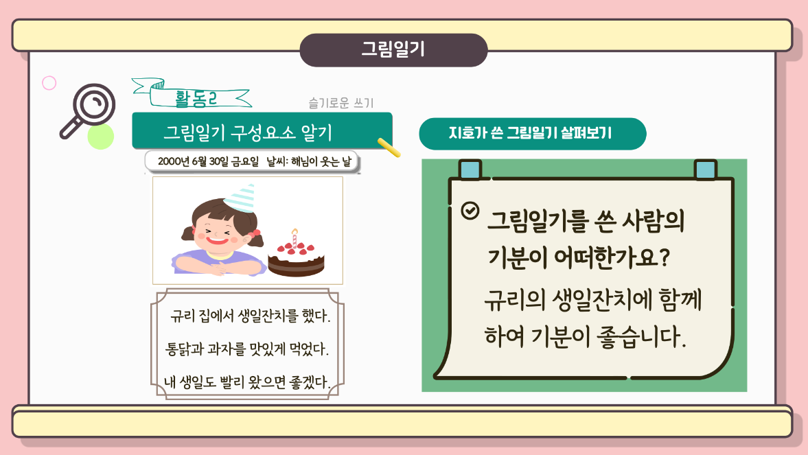 - 글: 생일잔치 때 있었던 일과 그 일에 대한 자신의 생각이나 느낌을 쓴 것입니다.