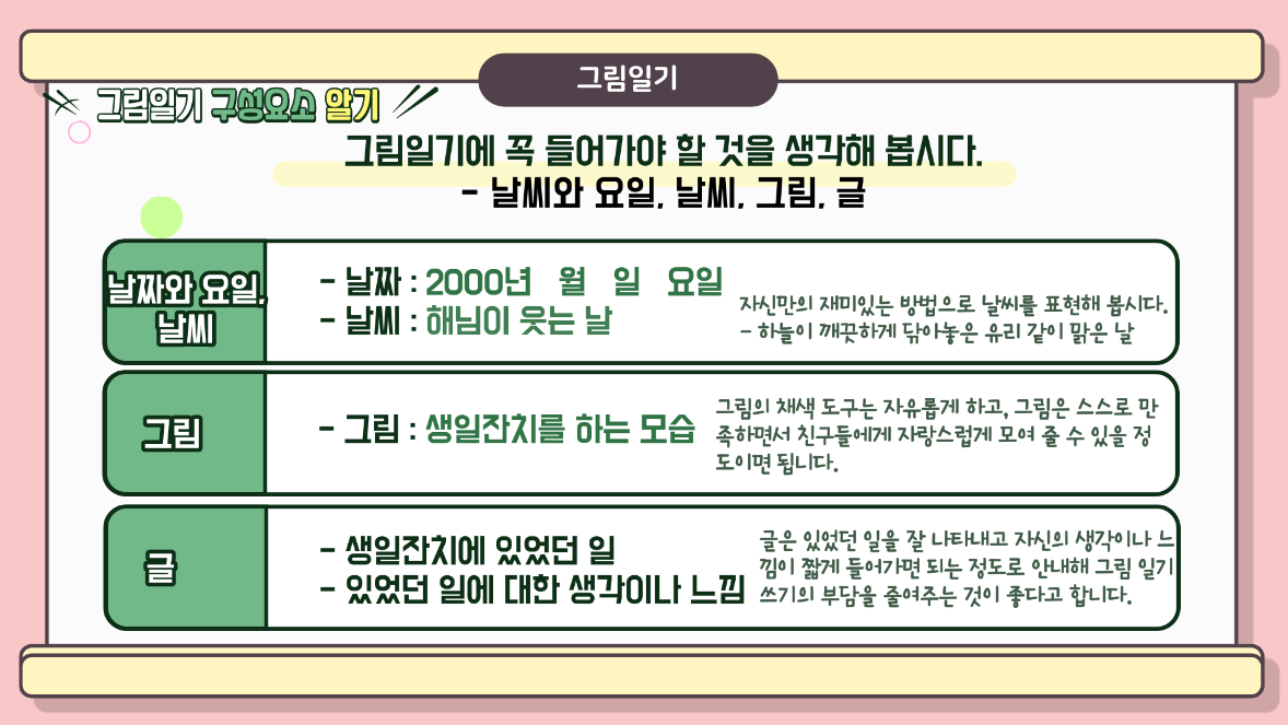 - 글은 있었던 일을 잘 나타내고 자신의 생각이나 느낌이 짧게 들어가면 되는 정도로 안내해 그림일기 쓰기의 부담을 줄여주는 것이 좋다고 합니다.