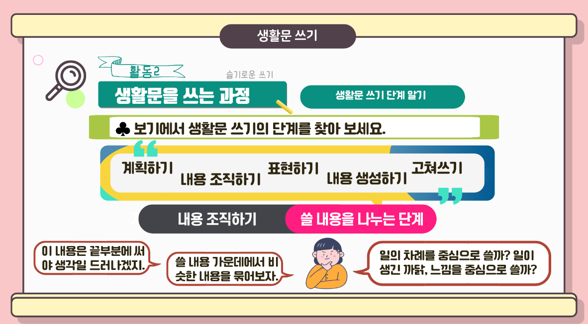- 내용 조직하기: 쓸 내용을 나누는 단계