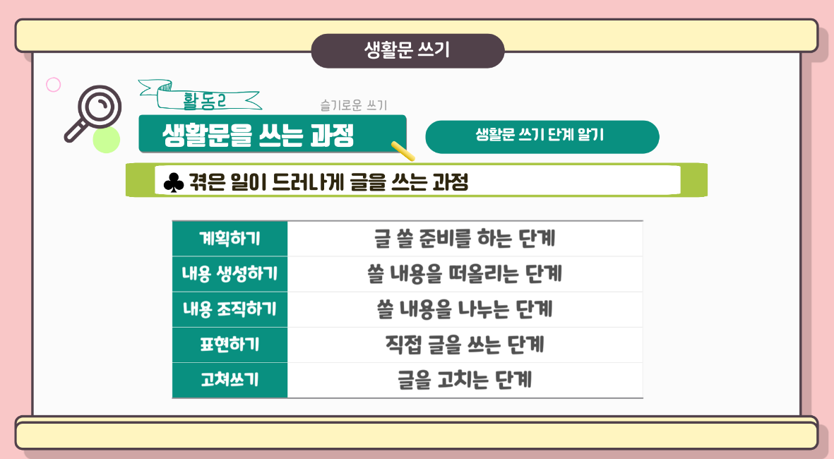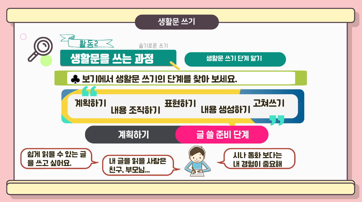 - 생활글을 쓰기 위한 글감의 사건이 시작됩니다.