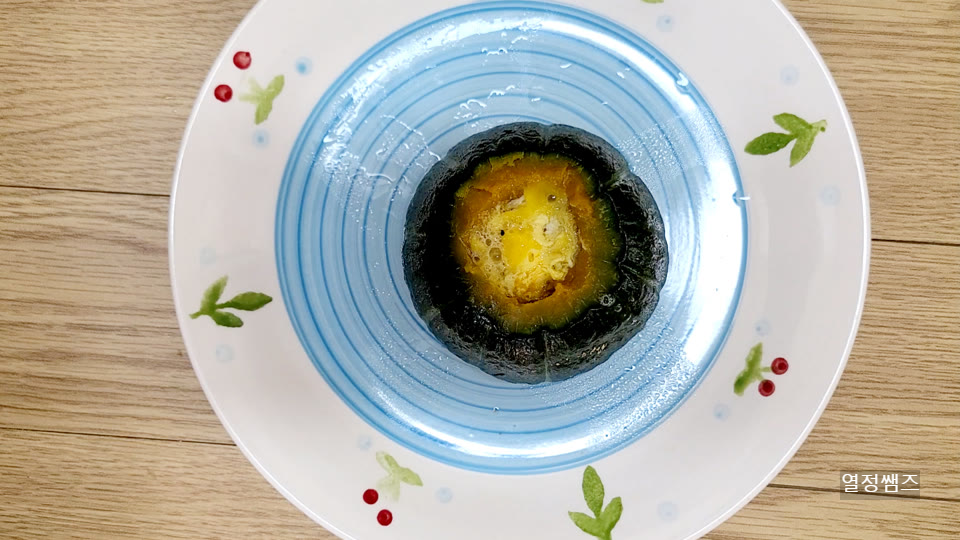 - 단호박 안의 달걀이 부풀어 오릅니다. 단호박이 미니다 보니 달걀이 많이 부풀어 올랐습니다.