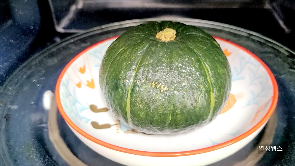 - 씻은 단호박을 전자레인지에서 3분간 쪄줍니다. 전자렌지를 이용해서 간단하게 단호박을 찔 수 있습니다.