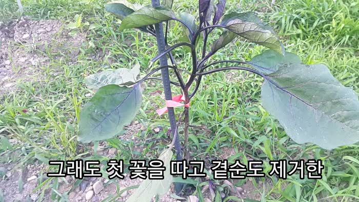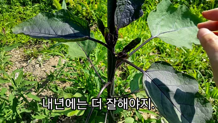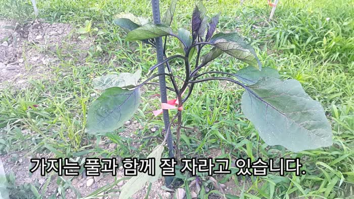 가지는 풀과 함께 잘 자라고 있어요. 운동 삼아 하루에 20분씩 풀을 제거하자.