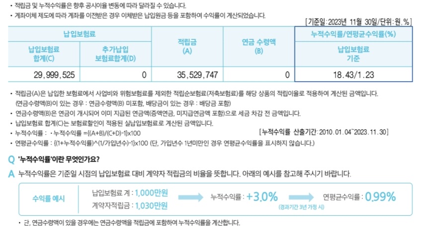 누적수익률은 기준일 시점의 납입보험료 대비 계약자 적립금의 비율을 뜻한다고 합니다.