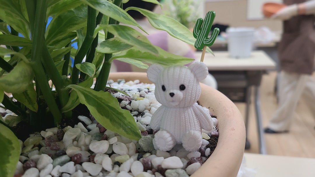 예쁜 선인장과 곰 장식이 화분을 더욱 예쁘게 보여줍니다.