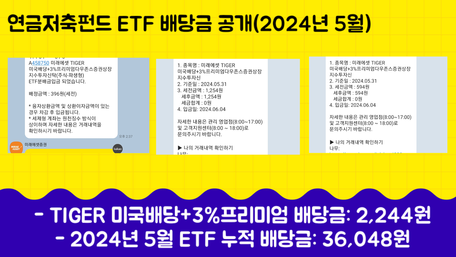 2024년 4월달부터 연금저축펀드 ETF 배당금을 정리하기 시작하였습니다. 과연 얼마의 배당금이 들어올까 궁금함과 함께 정리를 해 놓을 필요가 있어서 유튜브와 블로그에 기록으로 남기기로 했습니다.