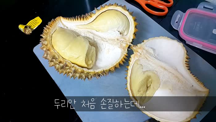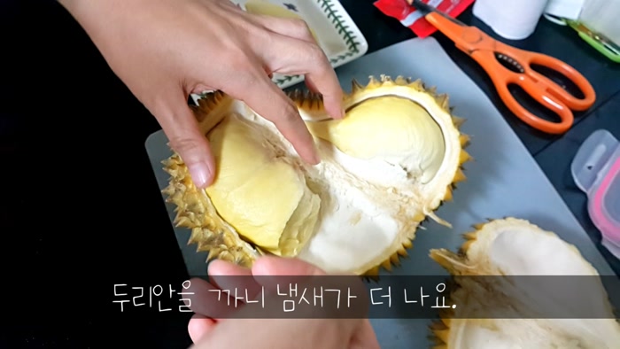 두리안을 까니 냄새가 더 나네요. 깜짝 놀랐네요.