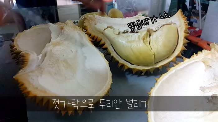 다시 젓가락으로 두리안을 벌렸어요. 아이들도 두리안 냄새에 놀라네요.