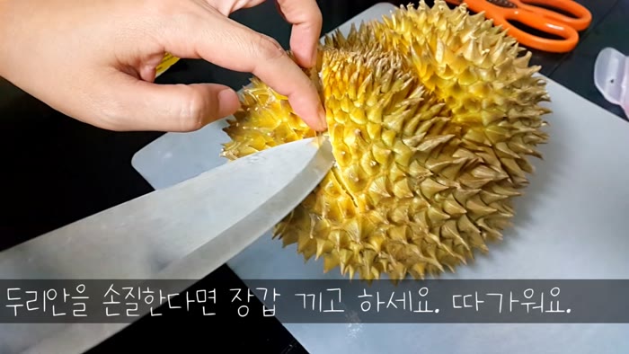 두리안 손질을 할 때 두꺼운 장갑을 끼는 것이 좋아요. 뾰족한 것이 손을 찔러요.
