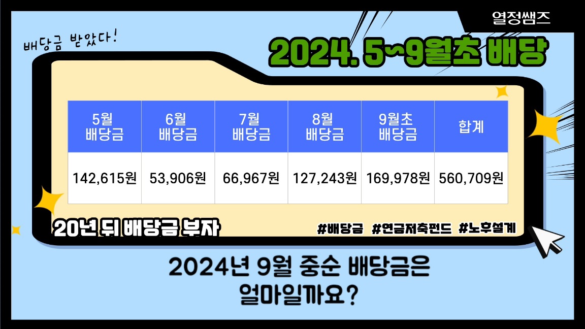 2024년 9윌 초 배당금은 169,978원입니다. 2024년 5월부터 9월초까지 배당금은 560,709원입니다.