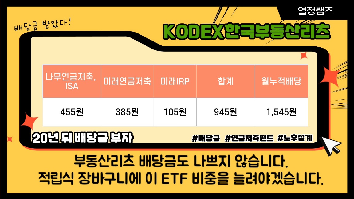 KODEX 한국부동산리츠 ETF으로 9월 중순에 받은 배당금은 945원입니다.