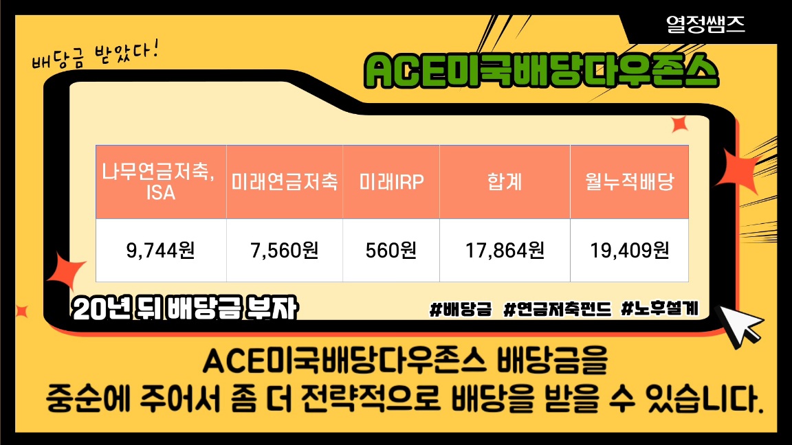 ACE미국배당다우존스 배당금을 중순에 주어서 좀 더 전략적으로 배당을 받을 수 있습니다.
