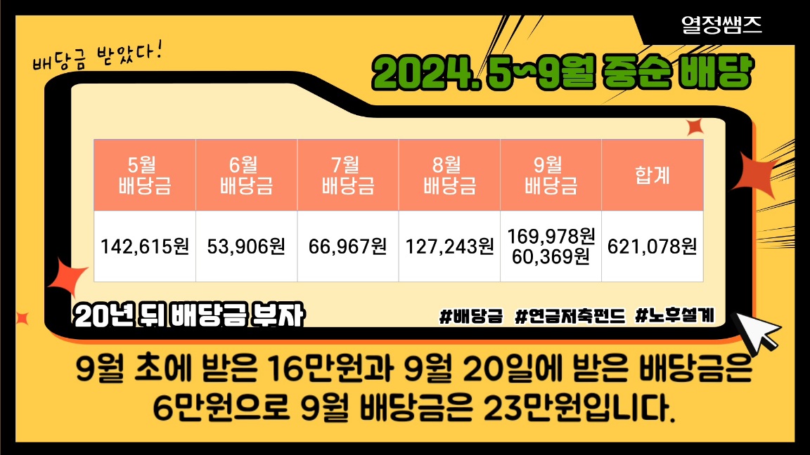 2024. 5~9월 중순 배당금은 621,078원입니다. 처음 분배금이 들어올 때는 몇 십원, 몇 백원이라 돈이 작았는데 푼돈이라고 생각을 했습니다. 정말 티끌 모아 태산입니다.