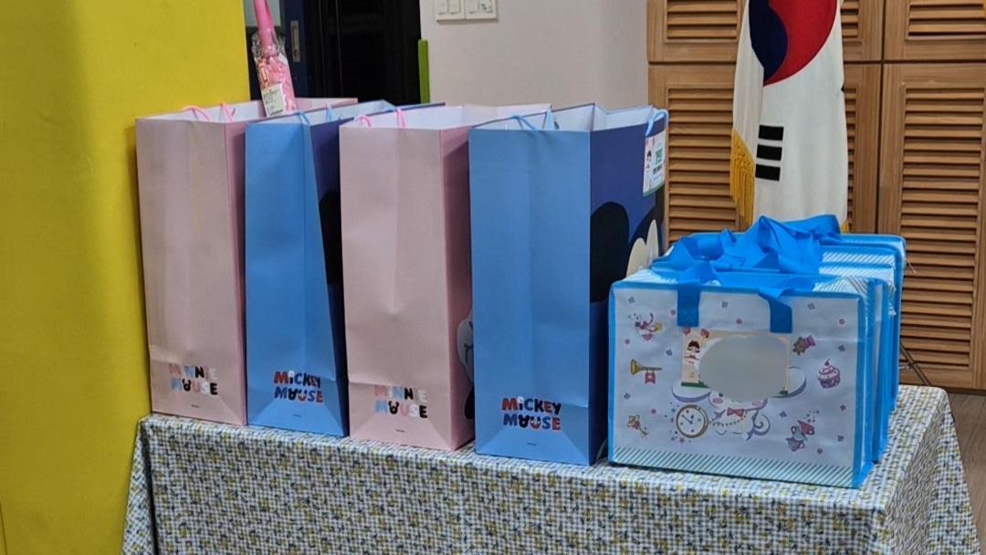 다이소 미키마우스 가방에 담아서 드렸습니다.