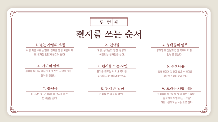 - 편지도 글입니다. 가볍게 인사를 시작으로 이야기를 펼쳐가다가 자신의 감정과 의사를 전하고 끝이 나ㅏ야 합니다. 편지도 기승전결이 있습니다.