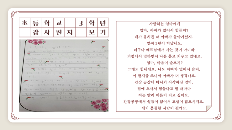 이 편지는 다문화학생이 적은 것입니다. 마음이 아픕니다. 아빠의 빈자리가 조금은 채워졌으면 좋겠습니다.