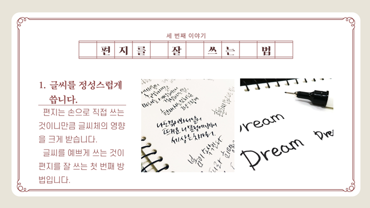 - 편지는 손으로 직접 쓰는 것이니만큼 글씨체의 영향을 크게 받습니다. 글씨를 예쁘게 쓰는 것이 편지를 잘 쓰는 첫 번째 방법입니다.