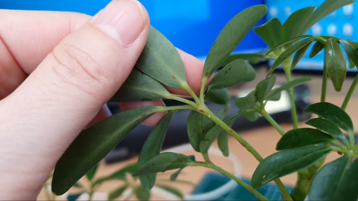 깍지벌레 때문에 홍콩야자 잎에 상처가 나고, 조금 끈적거립니다.