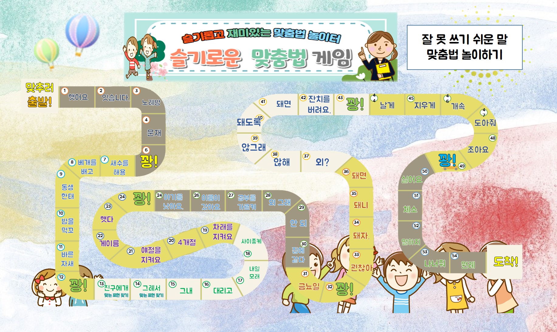교실이나 가정에서 한글 맞춤법으로 맞춤법을 지도할 때 유용하게 사용할 수 있습니다.