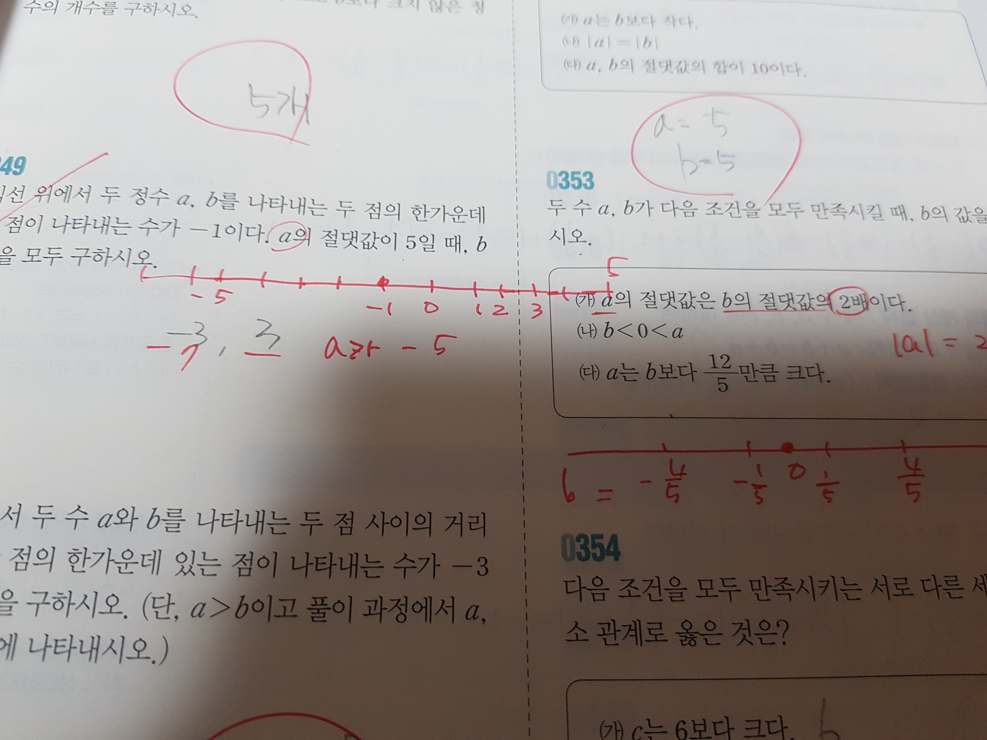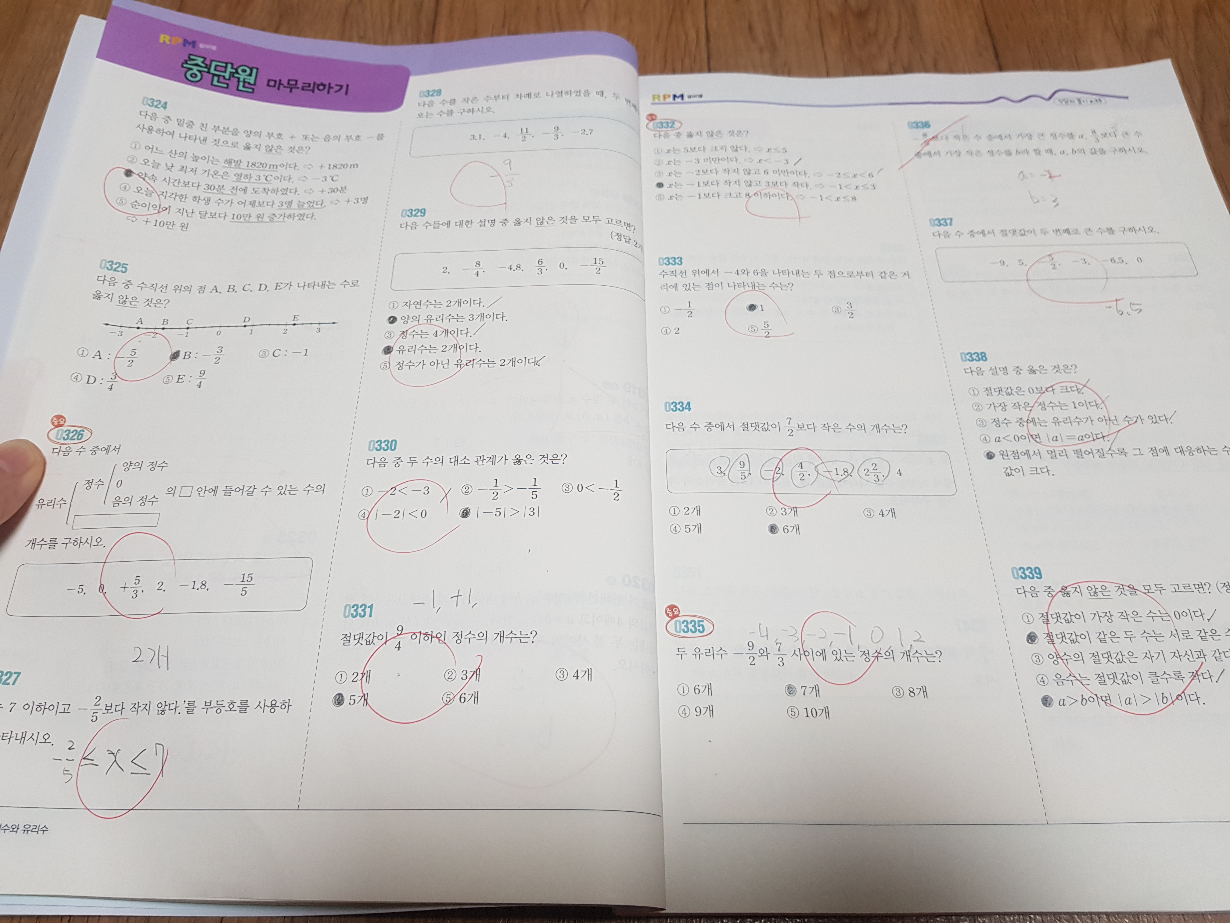 집에 오니 학교에서 풀은 개념원리 RPM을 보여주네요. 한 바닥을 채점했어요. 2단원 유리수 부분은 잘 푸네요. 그나마 다행이네요.