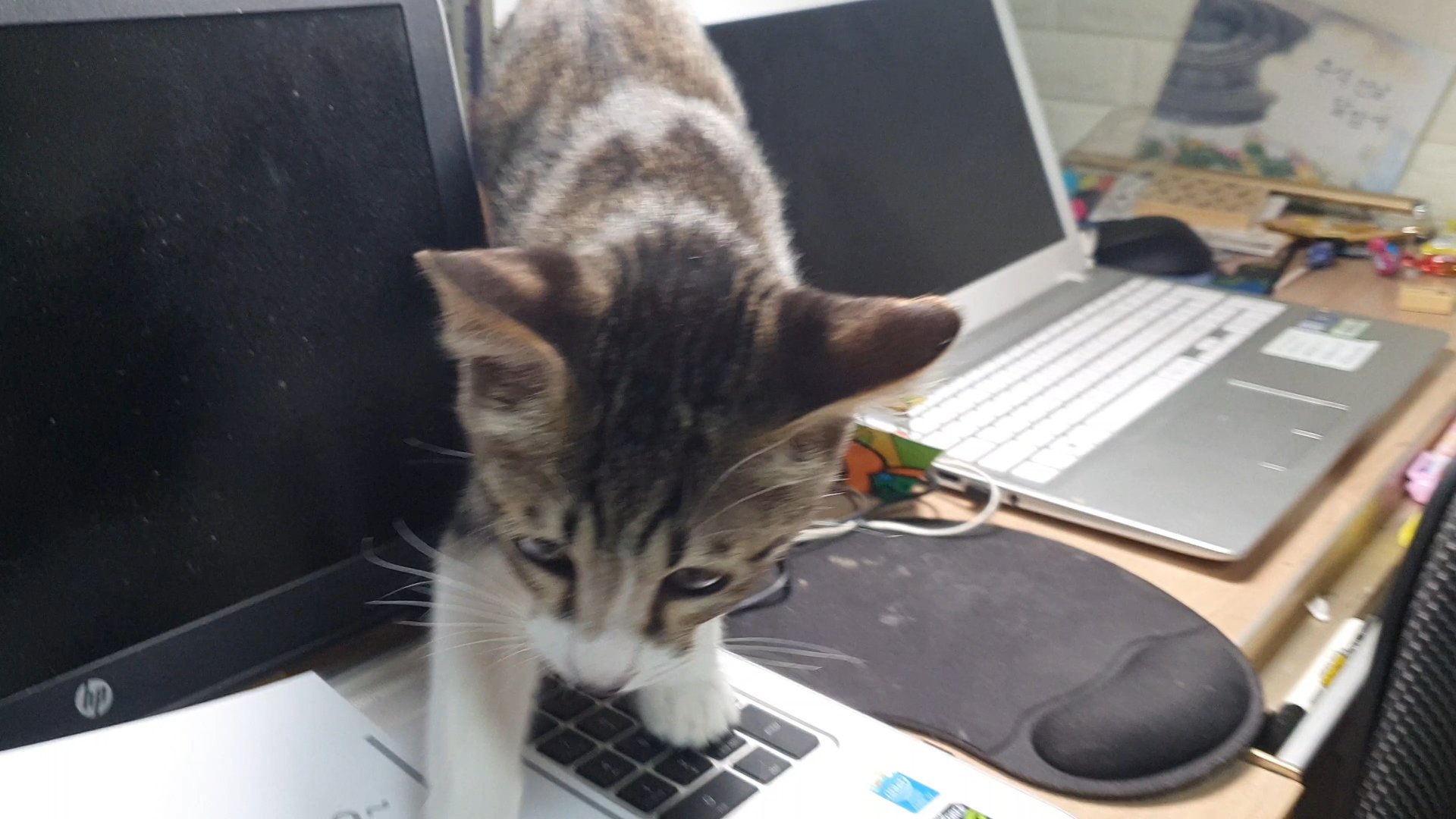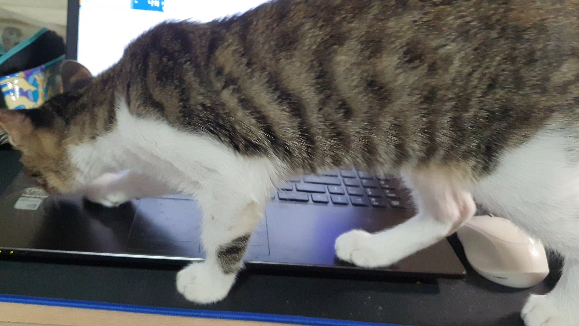행복이는 집사의 마음을 모르고 신기하게 노트북을 밟고 갑니다.