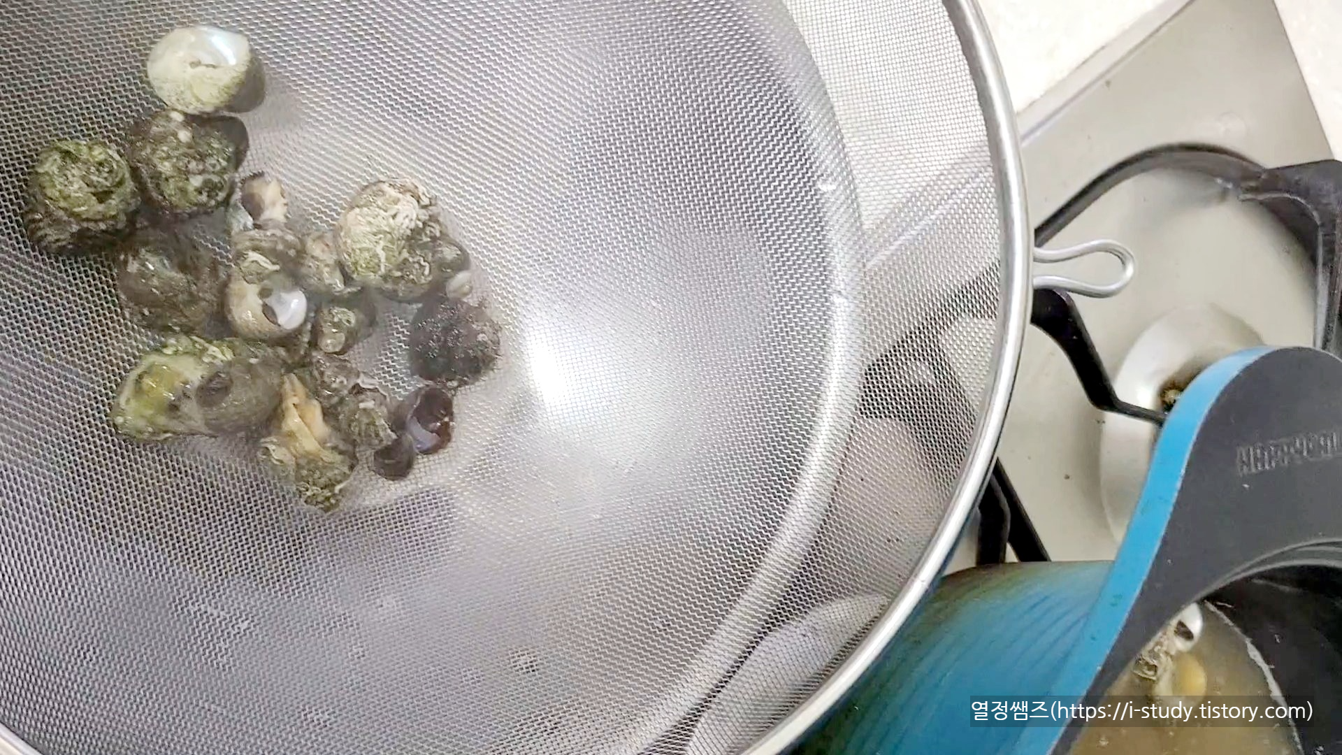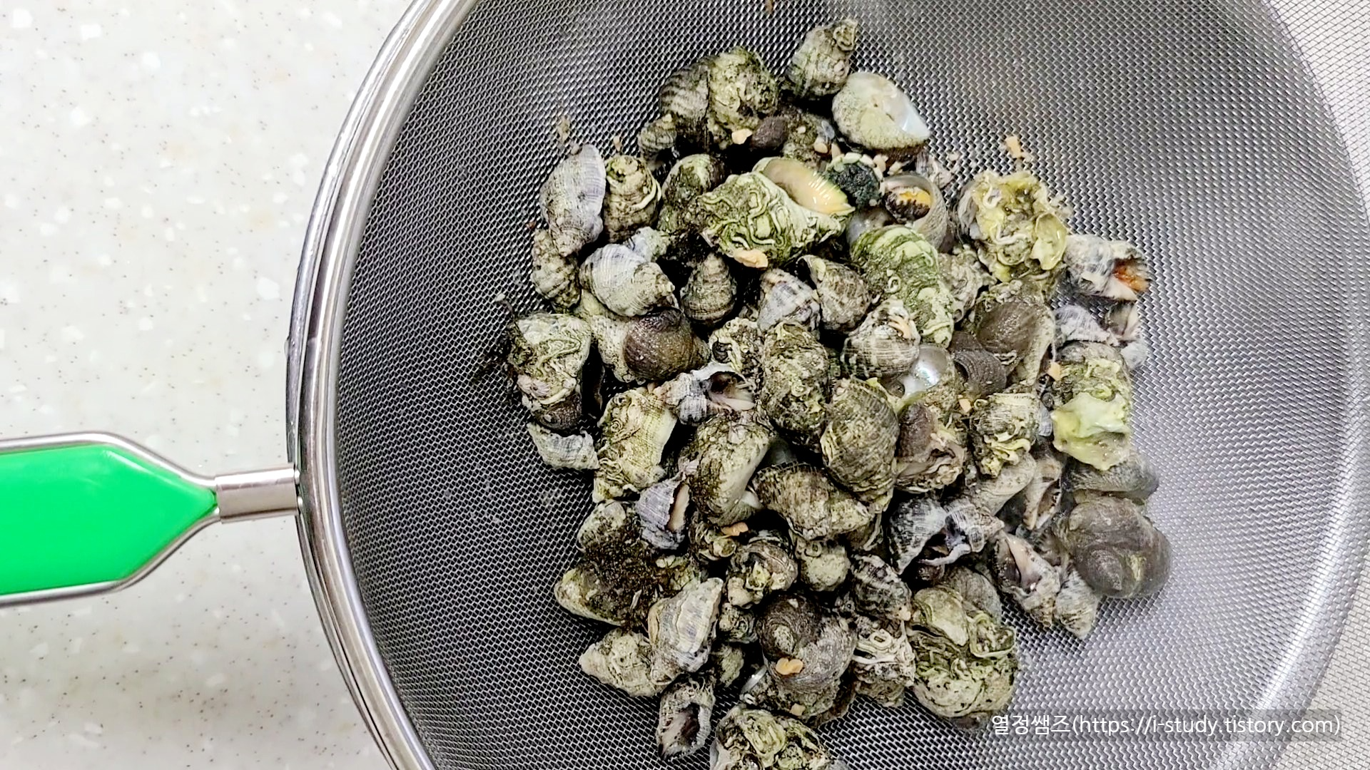 5. 10분간 삶은 고동을 채반에 건져 식혀줍니다.