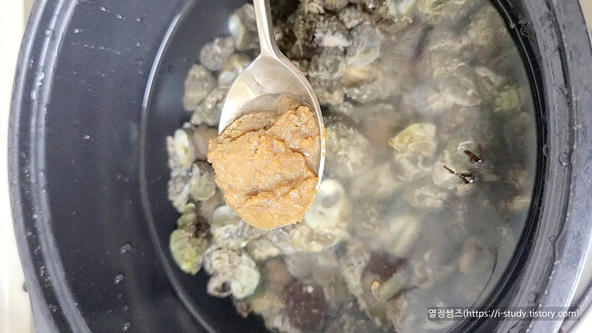 4. 고동이 잠길 정도로 물을 넣고 된장을 한 숟가락 넣고 10분간 끓입니다.